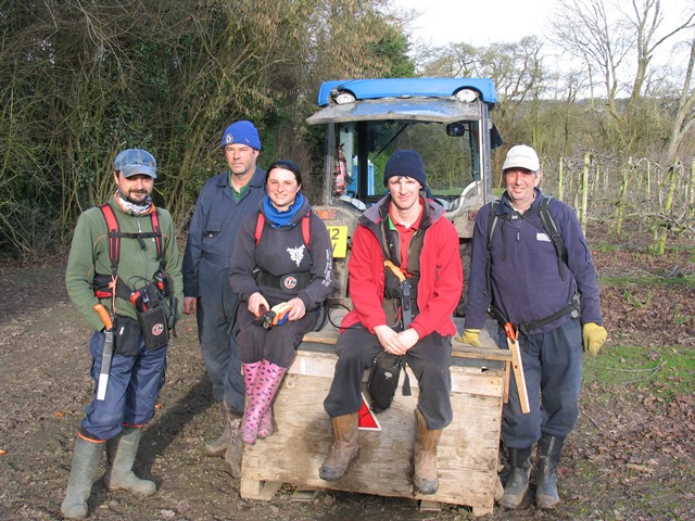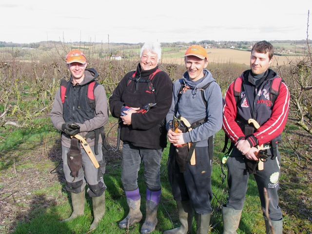 As we approach mid-March, we have good progress to report with the tree pruning.  The weather has been colder than normal, but fairly dry so we have lost very few days to bad weather.  The pear team is within 2 days of finishing (pictured left, Stanislav; Carol; Saulius and Sarunas) and the apple team is now in the South end of the farm, heading for the last few orchards (pictured right, Rob; Ray; Cristina; Graham and Jeff).  Fruit bud is plentiful and the trees are looking good.  The pear team will turn their attention to planting the new Bramley apple orchard as soon as the soil dries up sufficiently, so the trees will go into warmer soil and establish quickly.