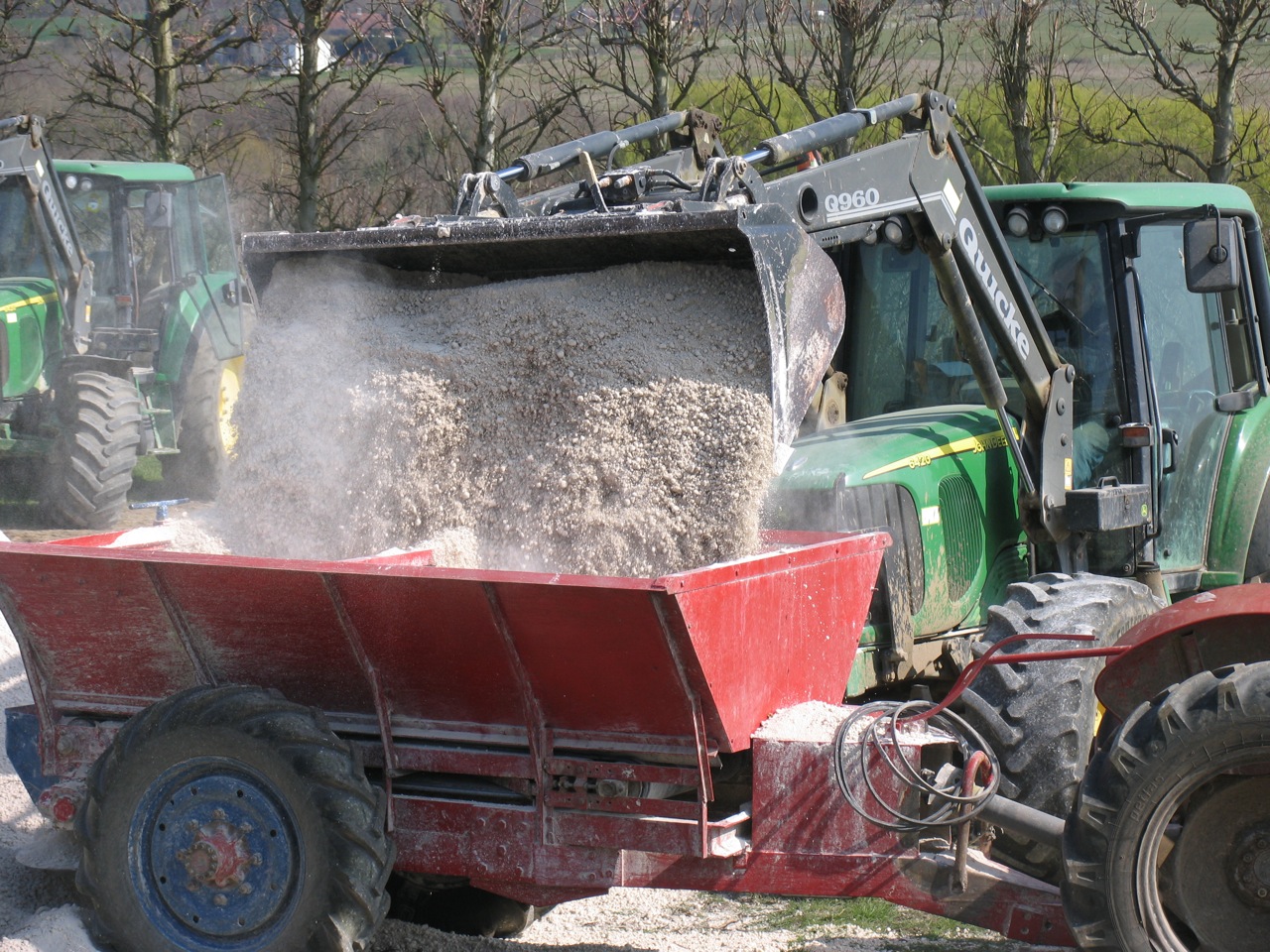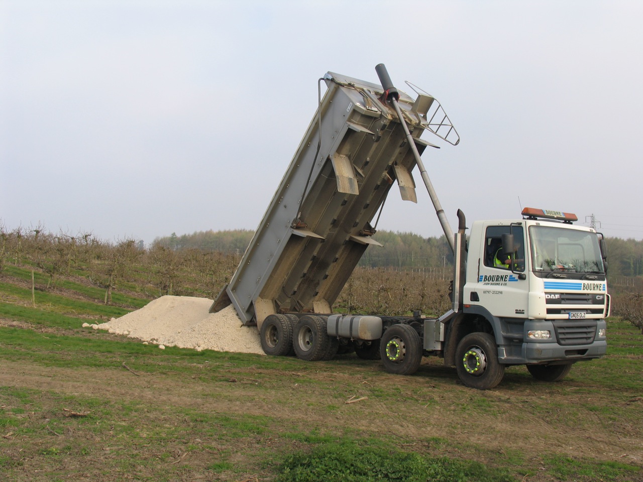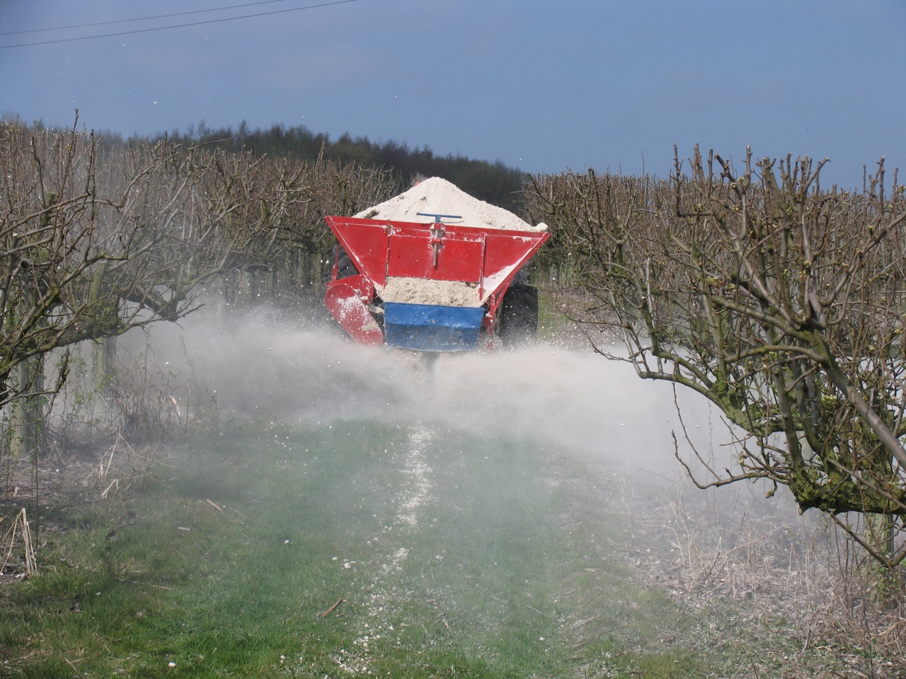 The weather in March has been unusually warm and dry, bringing dormancy to an end and causing the buds to burst. The tree roots need optimal soil conditions to grow, so this is the time to put on fertilizer and check the acidity of the soil. Testing showed an area of the farm with an increased acidity level. The dry ground conditions allowed our contractors to spread limestone on the affected areas, which should last for several years.